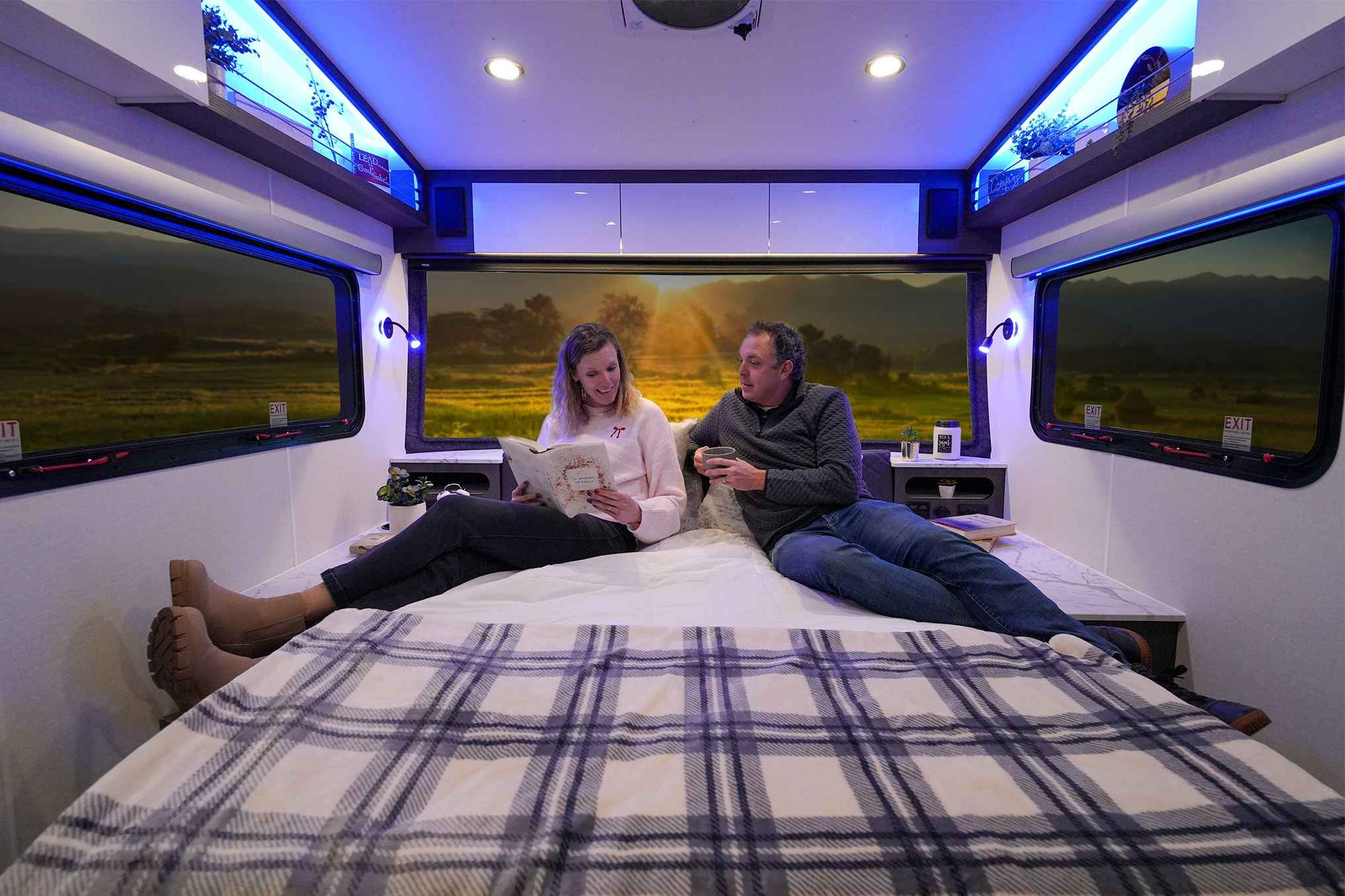 Enjoy a large front bedroom featuring a breathtaking panoramic windshield that fills the space with natural light and offers stunning views. Sleep soundly on a true residential 60x80 queen bed, designed for ultimate comfort. This thoughtful design ensures a perfect night's rest with the convenience of standard sheets.