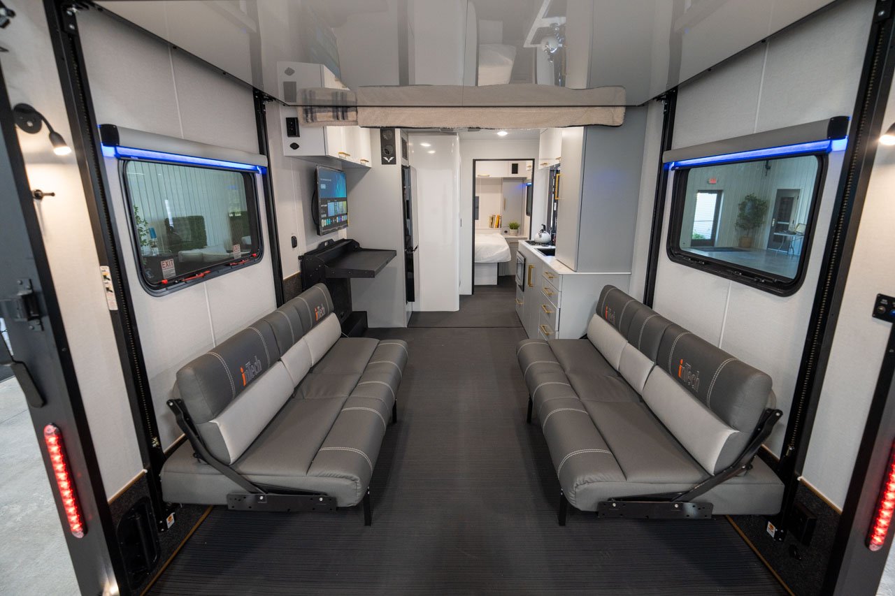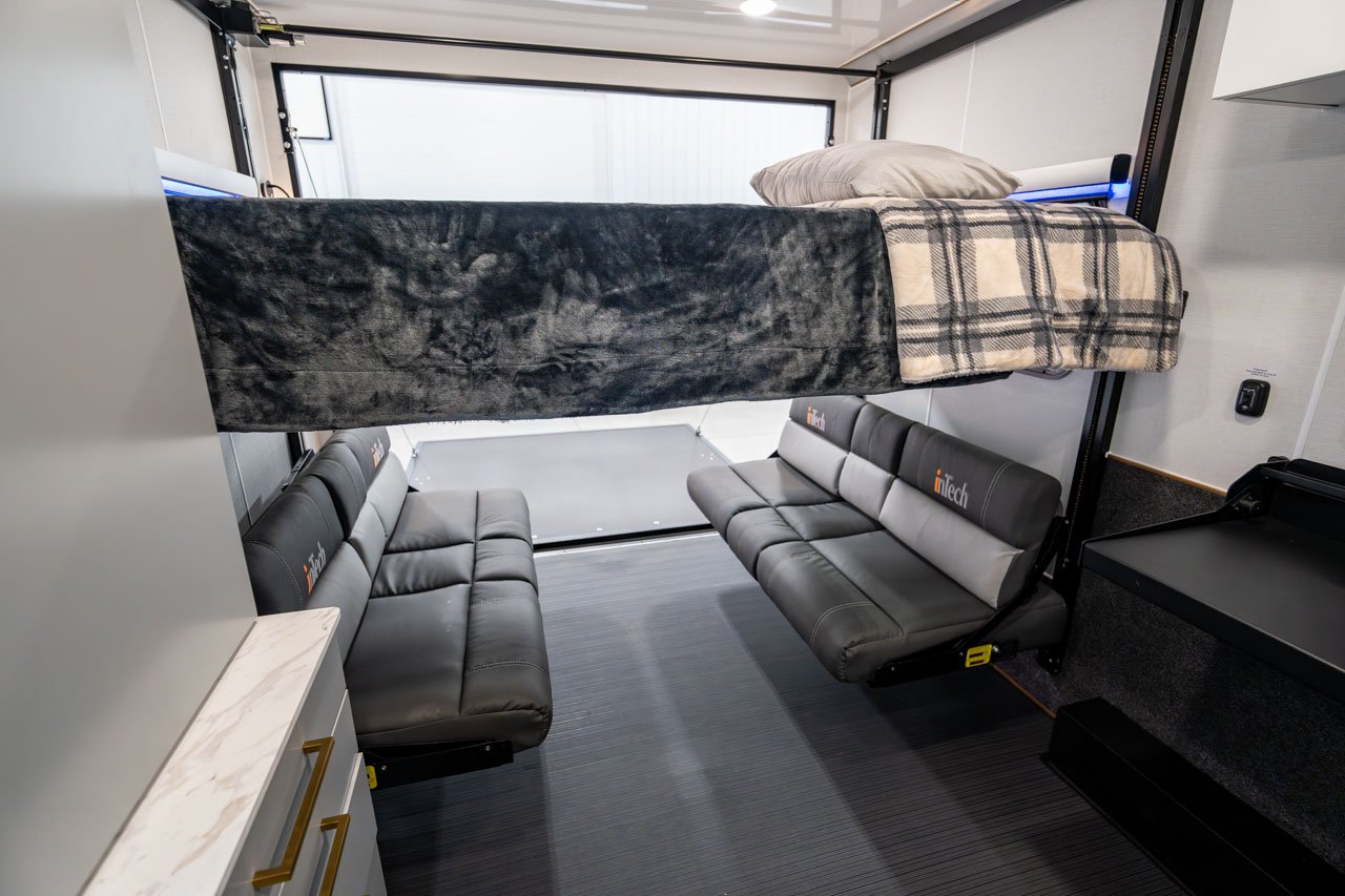 The Happi Jac Bed and sofa set-up in the Black Wing is a game-changer for those who value versatility on their adventures. This innovative design transforms your space to meet any need—whether it's for sleeping, dining, extra storage, or even creating a garage for your gear. With just a simple adjustment, you can create the perfect setup for any moment.